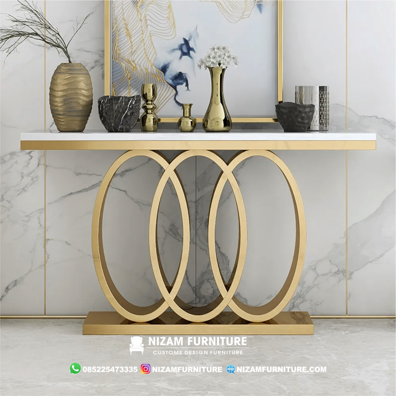 Jual meja konsol stainless steel emas top marmer NF47 salah satu komponen penting di dalam interior rumah dengan design modern. Fungsi utama nya adalah sebagai tempat meletakkan sementara barang dan juga sebagai dekorasi utama pada ruang keluarga. Dengan desain yang ramping dan tidak memakan space namun tetap tidak melupakan fungsionalnya menjadi pilihan meja milenial masa kini. Bisa ditempatkan bebas di ruang keluarga, ruang kamar tidur ataupun difungsikan sebagai meja tulis dan make-up.