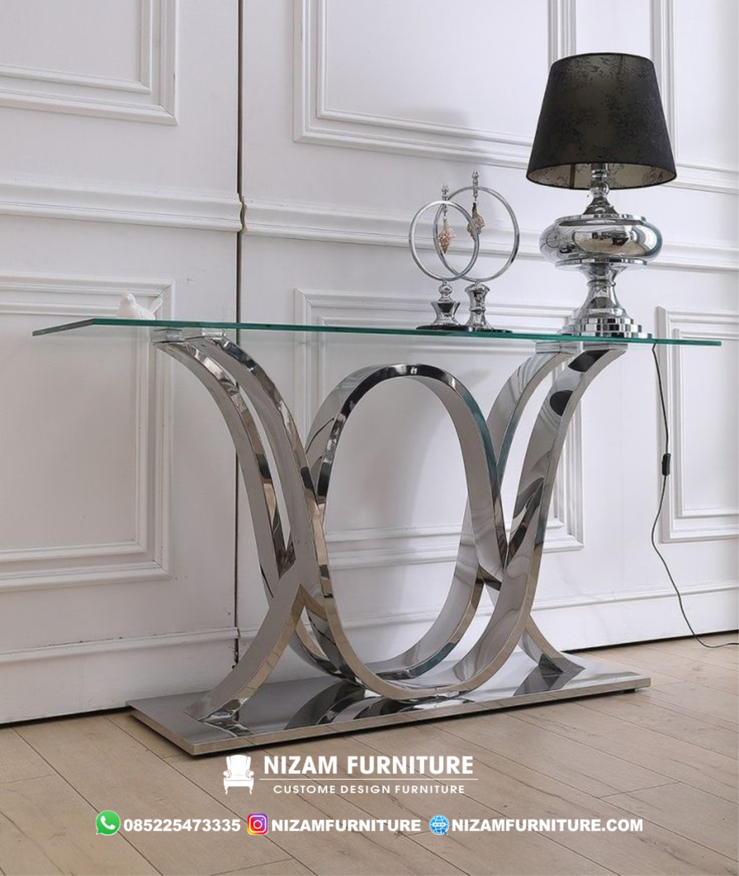 Meja konsol minimalis terbaru bahan besi silver NF45 salah satu komponen penting di dalam interior rumah dengan design modern. Fungsi utama nya adalah sebagai tempat meletakkan sementara barang dan juga sebagai dekorasi utama pada ruang keluarga. Dengan desain yang ramping dan tidak memakan space namun tetap tidak melupakan fungsionalnya menjadi pilihan meja milenial masa kini. Bisa ditempatkan bebas di ruang keluarga, ruang kamar tidur ataupun difungsikan sebagai meja tulis dan make-up.