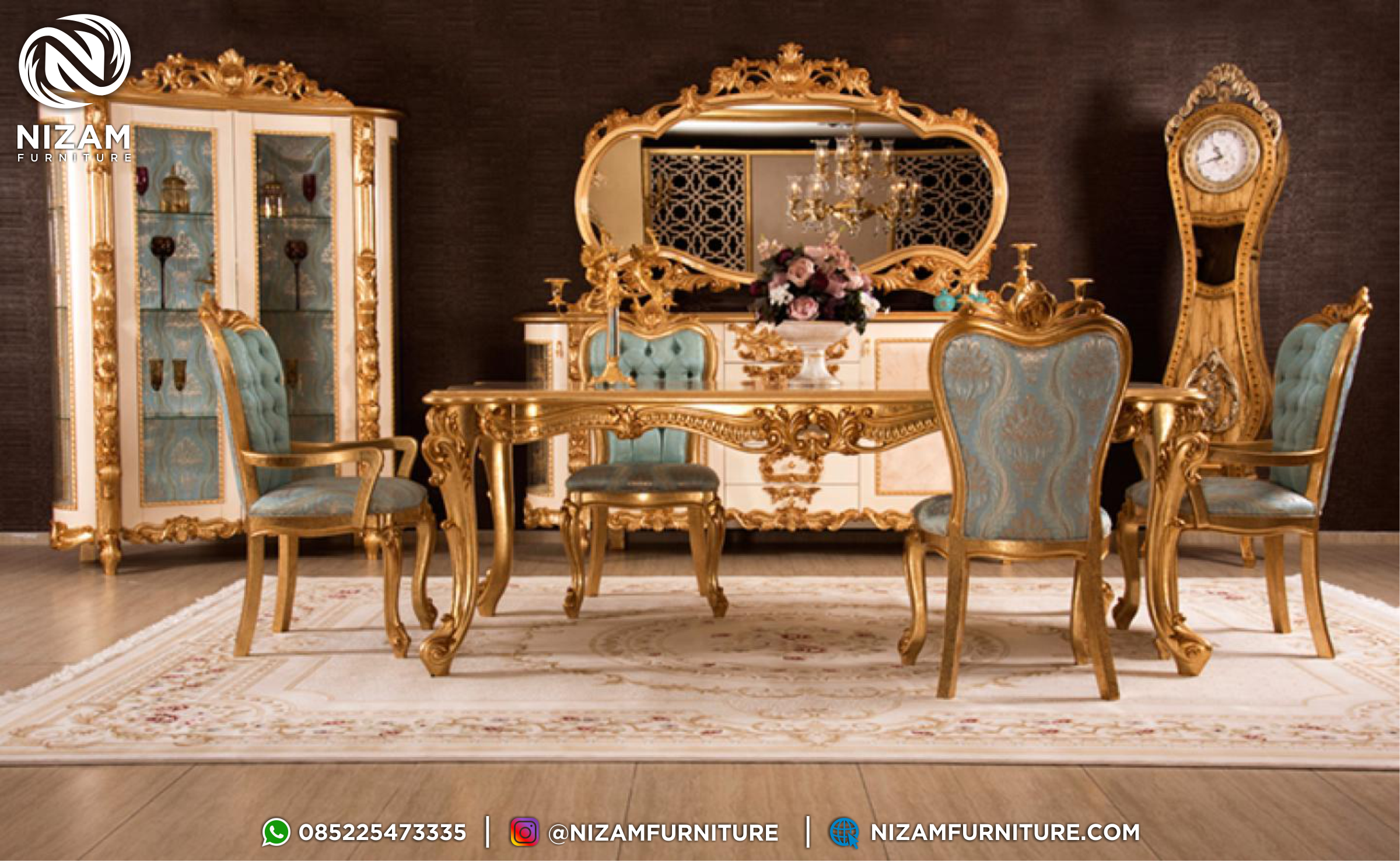 Meja Makan Mewah 1 Set Desain Ukir Cantik NF72